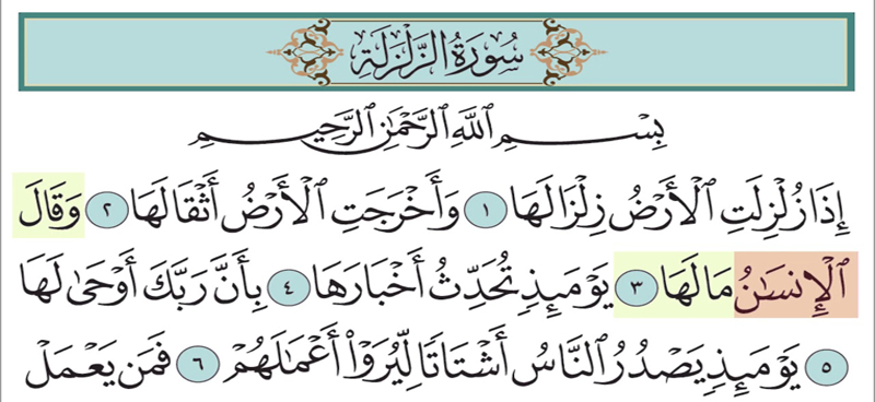 إِذَا زُلْزِلَتِ الْأَرْضُ زِلْزَالَهَا (1)وَأَخْرَجَتِ الْأَرْضُ أَثْقَالَهَا (2)وَقَالَ الْإِنسَانُ مَا لَهَا (3)يَوْمَئِذٍ تُحَدِّثُ أَخْبَارَهَا (4)بِأَنَّ رَبَّكَ أَوْحَىٰ لَهَا (5)